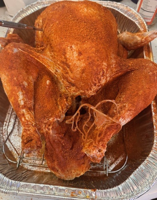 - Remove from the fridge after 1 hour, coat the turkey in the oil and liberally apply the rub to the entire turkey