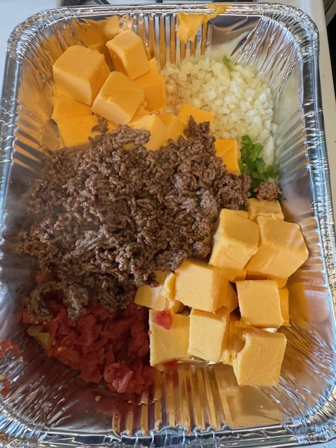 For the queso dip, I started with a medium yellow onion, finely diced it, and then added it to an aluminum tray. Then I grabbed a can of diced tomatoes with green chiles, added it to the tray, and chopped up a serrano pepper for some warmth and flavor. I then took a 32-oz “block” of Velveeta and cubed it up, adding it to the pan with everything else. I had a 1LB pack of 80/20 ground beef, browned it, and added a packet of taco seasoning, then this went into the pan as well. I topped it off with some freshly grated cheddar-jack cheese and put it on my Pit Boss Sportsman 1100 at 300 degrees.