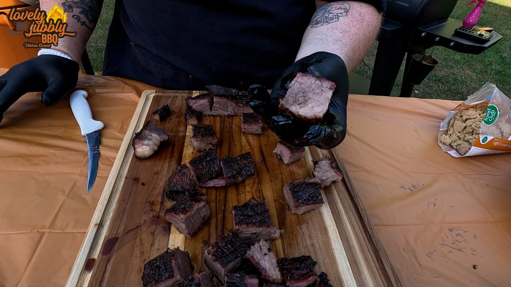 I put them back on the pit for about another hour to render more fat and allow the sauce/sugar mixture to caramelize. After an hour they looked like perfect little brisket nuggets and they smelled sensational. I pulled them out of the tray and into a small pile on the cutting board where I gave the review of the entire cook, and then it was finally time to eat. The first bite was soft, really strong beef flavor, and absolutely melt in your mouth perfect. The oak wood chunks gave a great smoke flavor that wasn’t over powering, and they were so juicy and tender.
