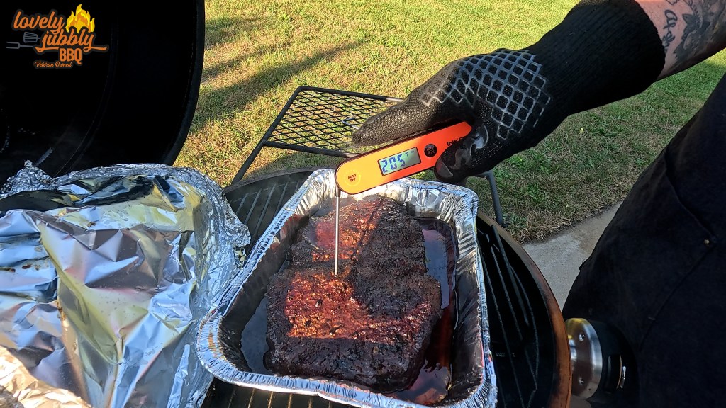 The plan for this cook was to put the brisket on at 250 degrees and let it cook to about 160-165 degrees internal and then wrap it until it hits around 205. It took about 3 hours for it to get to 165 degrees and then I placed it in an aluminum tray with a cup of Oxo beef stock to help reinforce the beef flavor that I wanted to maintain in the meat. It was wrapped for about 2 hours before it finally became probe tender, at right about the 205-207 degree mark.