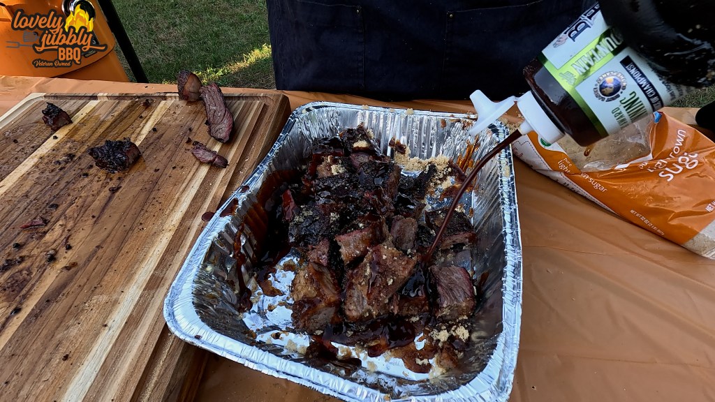 Once the brisket was done, I pulled it out of the tray and put it on the cutting board for about 10-15 minutes (covered with a bug shield, the flies were terrible) to allow it to cool down a little bit before cutting it up. If I had started cubing it up right after pulling it off the pit, it would have just fallen apart. Allow it to cool made it easier for me to cube it as needed. I then started cutting it up into 1″ strips against the grain, and then cut the strips into 1″ pieces as well. I then gave the cubes another layer of The Everything rub on all sides, and then moved them into another aluminum tray. True Kansas City style burnt ends should have an element of sweetness, so I gave the burnt ends a coat of light brown sugar and then another layer of Blues Hog Smokey Mountain BBQ sauce.